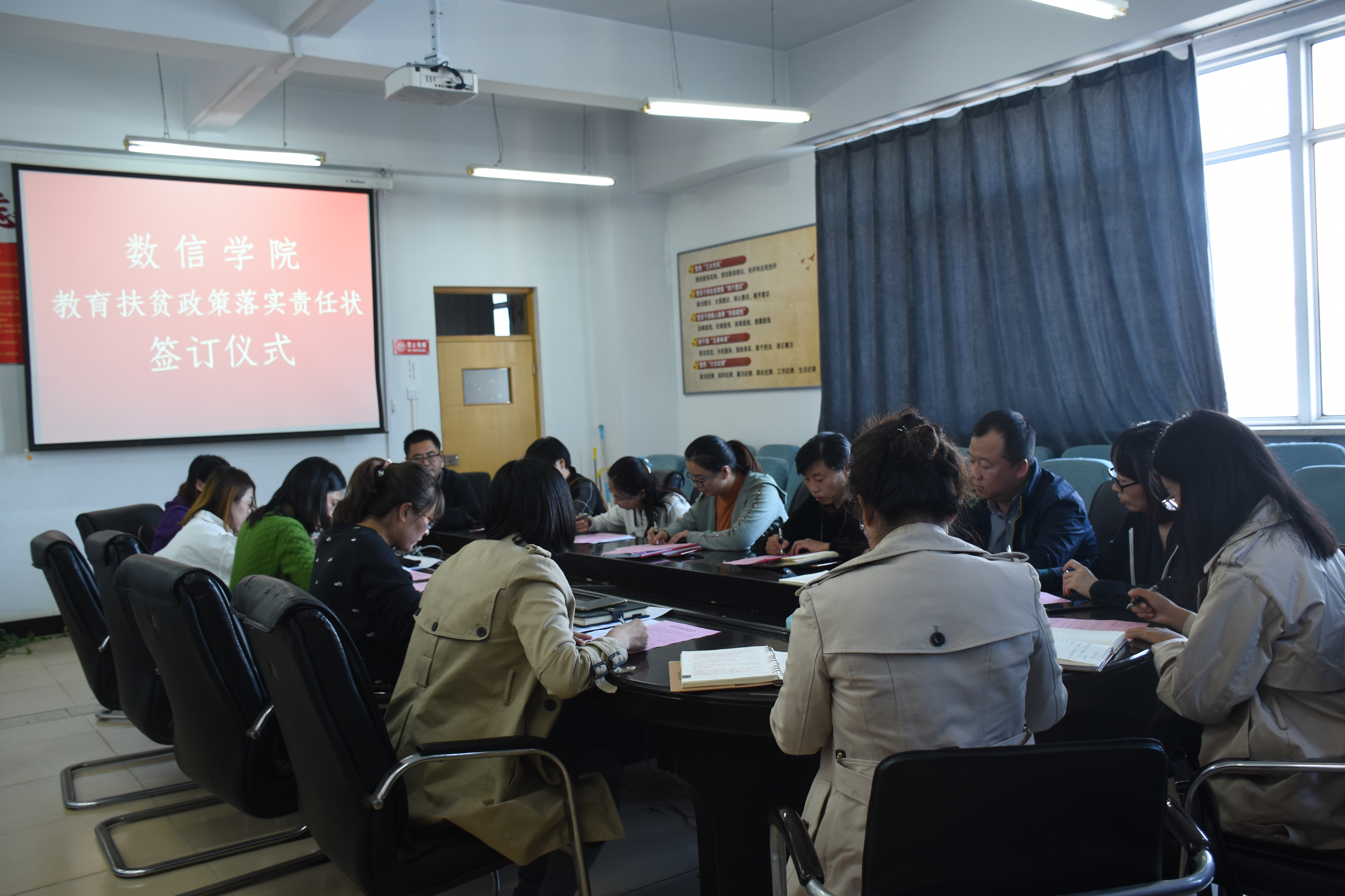 2018年10月11日下午,Beat365官方网站在秦皇岛校区逸夫楼Beat365官方网站1001会议室召开了全院各专业77个班级25名辅导员(班主任)参加的教育扶贫政策落实责任状签订仪式,组织与会辅导员(班主任)学习贯彻国家、省、学校教育扶贫有关政策文件和相关规定要求,对全院辅导员(班主任)工作提出了三点要求:一是要牢固树立“四个意识”、坚定“四个自信”,要不折不扣落实好中央和地方的教育扶贫政策,确保政策不走偏、不走样,帮助家庭经济困难学生顺利完成学业;二是在“三金”发放过程中不得有任何形式的截留、平分和挪用,杜绝一切严重影响教育扶贫事项发生;三是要教育引导受助贫困学生要勤俭节约,要把助学金用在保障基本正常学习生活急需上,禁止有铺张浪费、大吃大喝等行为。