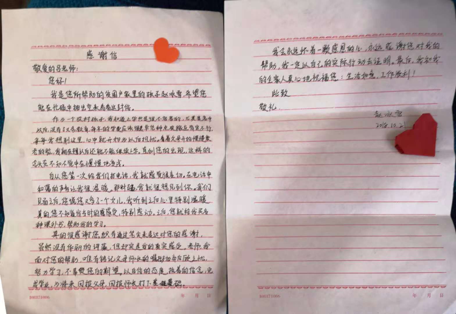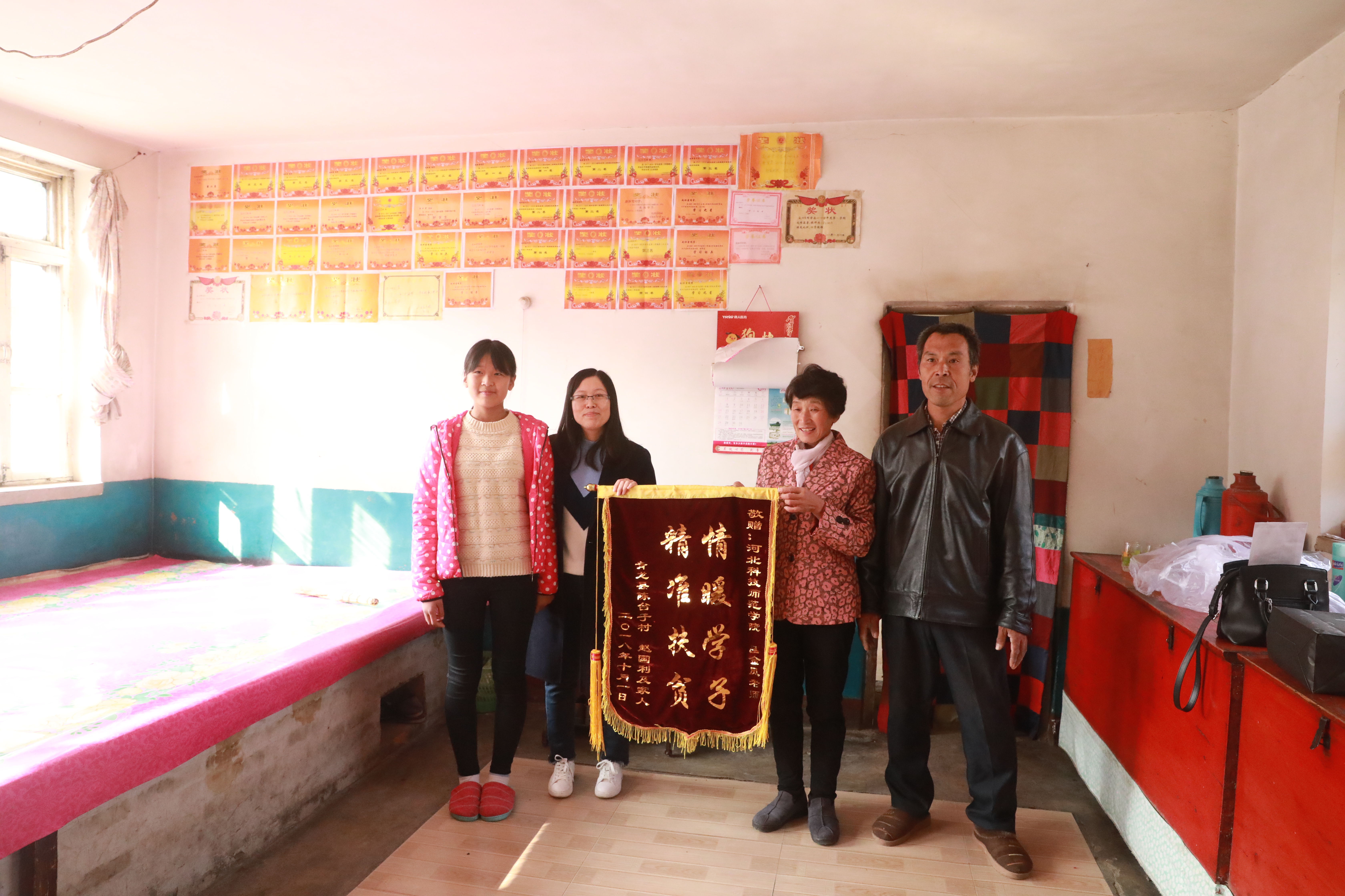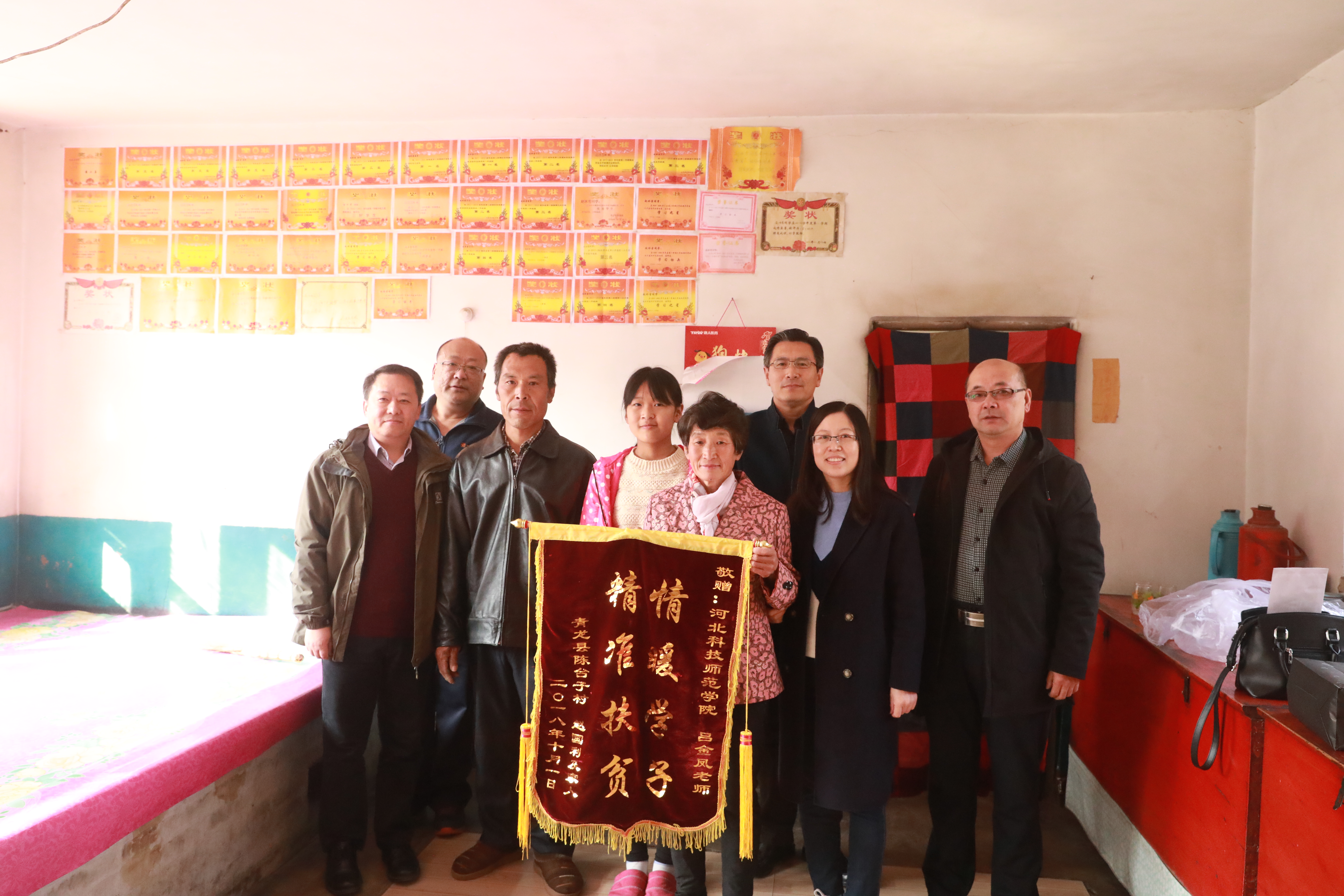 2018年11月3日,青龙陈台子村贫困户赵国利一家人,向我院结对帮扶责任人吕金凤老师赠送一面写有“情暖学子 精准扶贫”的锦旗。他们正在上初中的女儿赵冰雪给吕金凤老师写了一封情真意切的感谢信,一家人真心表达对吕金凤老师三年来对他们真情暖心扶贫助学的感激之情。Beat365官网驻陈台子村工作组组长、第一支部书记王伟,Beat365官方网站领导参加了赠送锦旗仪式。