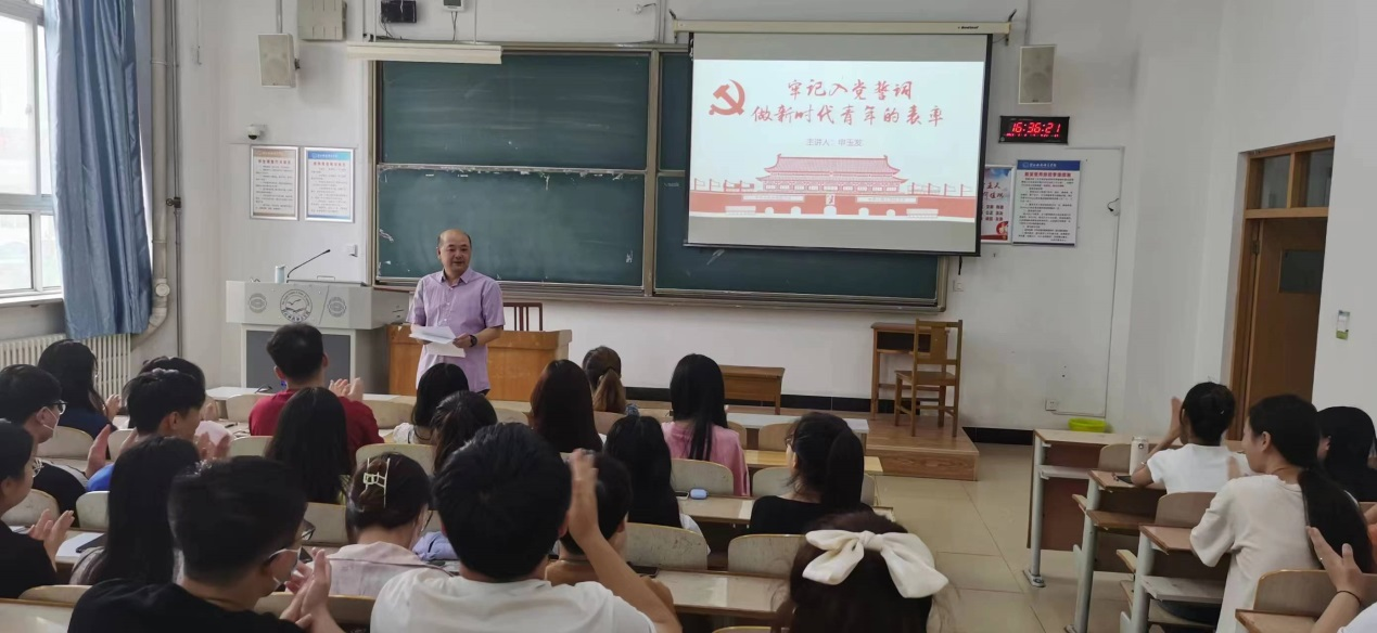 6月8日下午,Beat365官方网站党委书记申玉发为全体毕业生党员讲授以“牢记入党誓词,做新时代青年的表率”为题的专题党课。
