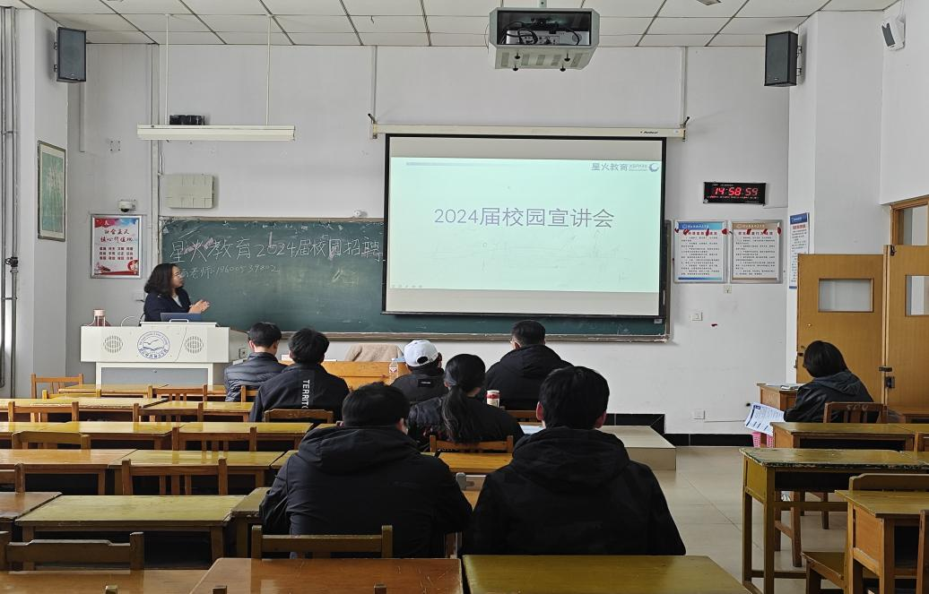 招聘会现场,星火教育的领导代表介绍了星火教育机构的基本情况,其中包含福利待遇、岗位需求以及应聘方式等方面。同时对于同学们提出的关于职业岗位的疑惑进行了细致的讲解和解答。现场的同学们积极投递简历,同时招聘方进行了笔试和授课流程测试,招聘流程井然有序。