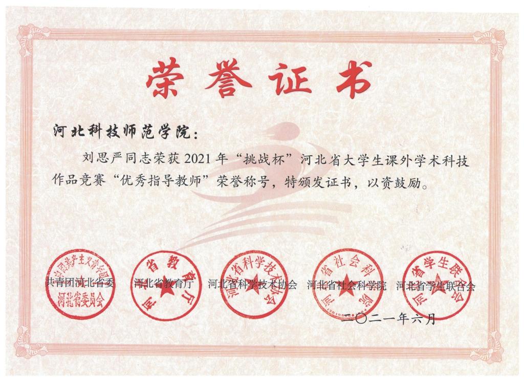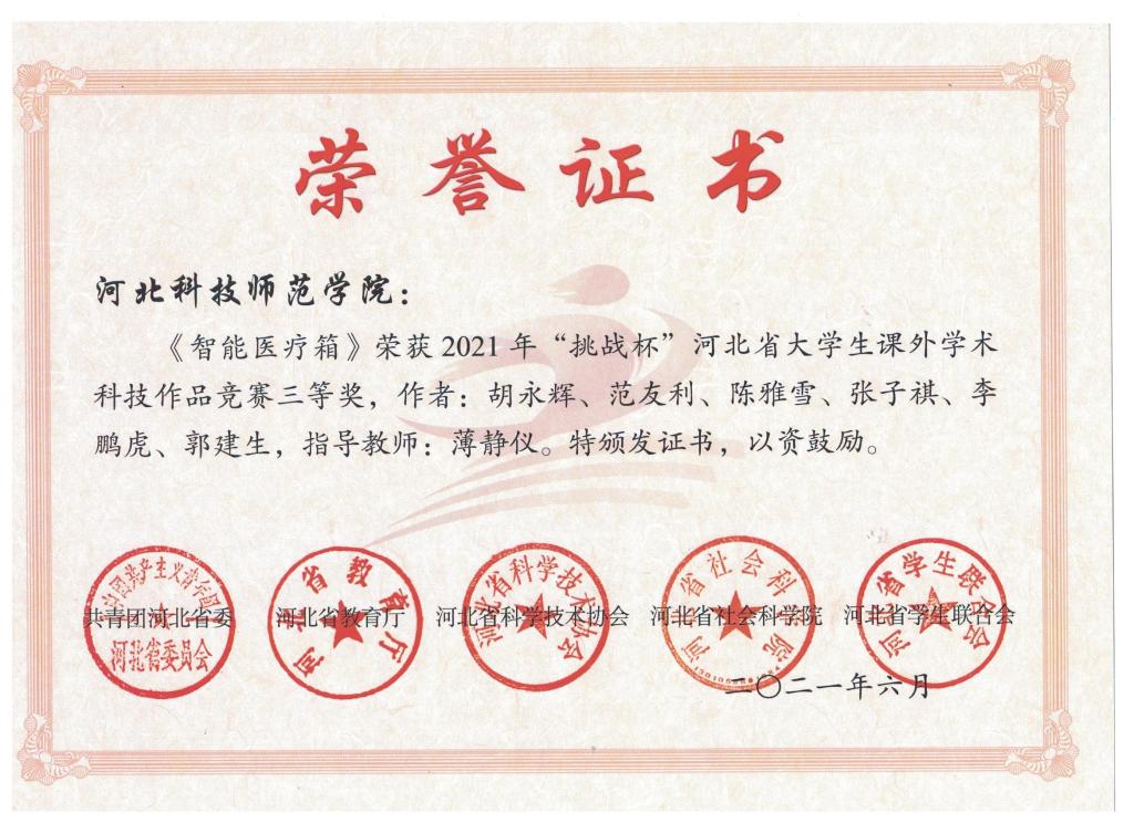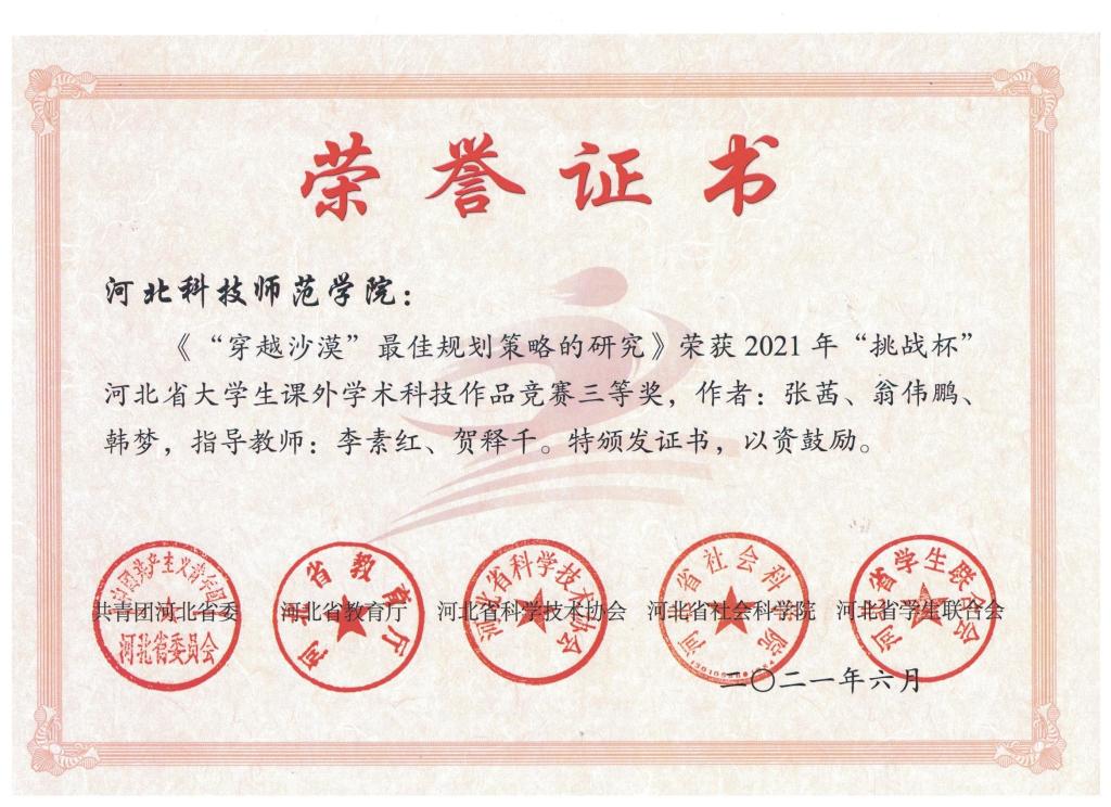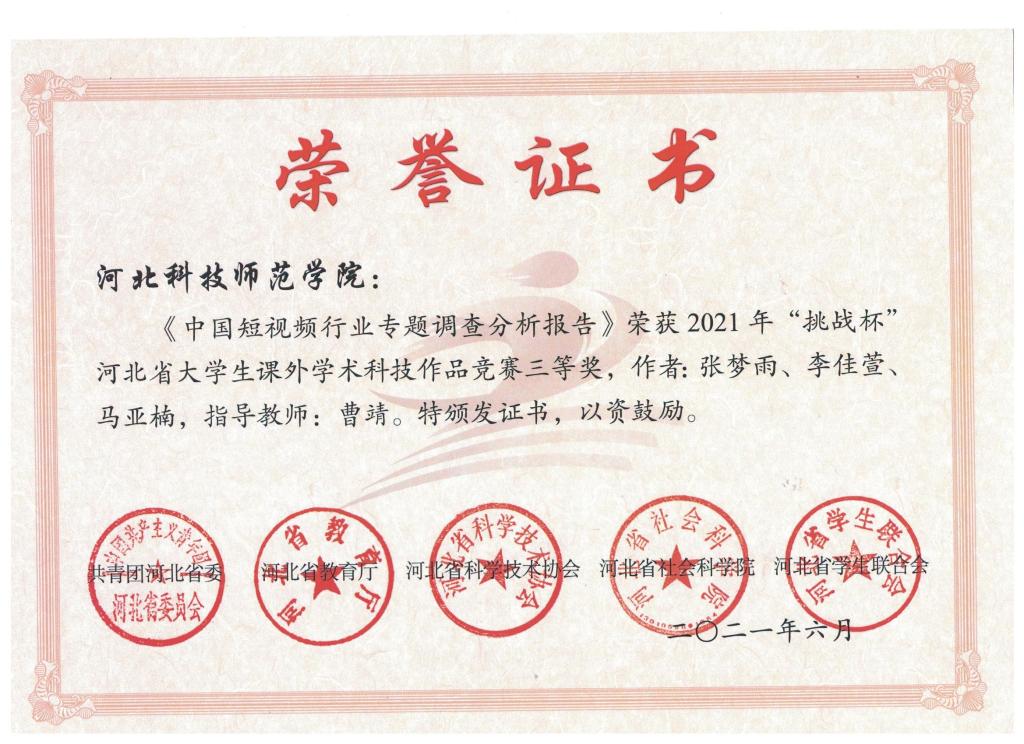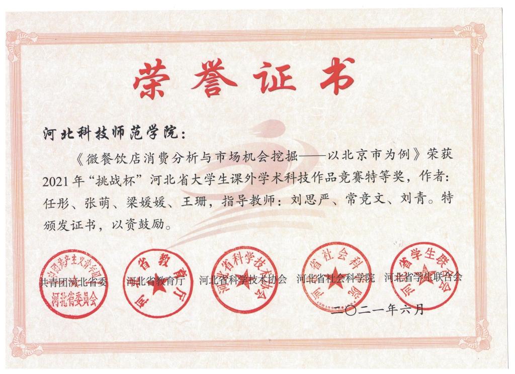 日前,共青团河北省委、河北省教育厅、河北省科学技术协会、河北省社会科学院、河北省学生联合会联合对2021年“挑战杯”河北省大学生课外学术科技作品竞赛获奖结果进行通报。我院有4件作品获奖,其中,《微餐饮店消费分析与市场机会挖掘--以北京市为例》作品获得大赛特等奖;《“穿越沙漠”最佳规划策略的研究》、《中国短视频行业专题调查分析报告》、《智能医药箱》3件作品获得大赛三等奖。此外,刘思严老师荣获2021年“挑战杯”河北省大学生课外学术科技作品竞赛“优秀指导教师”荣誉称号。