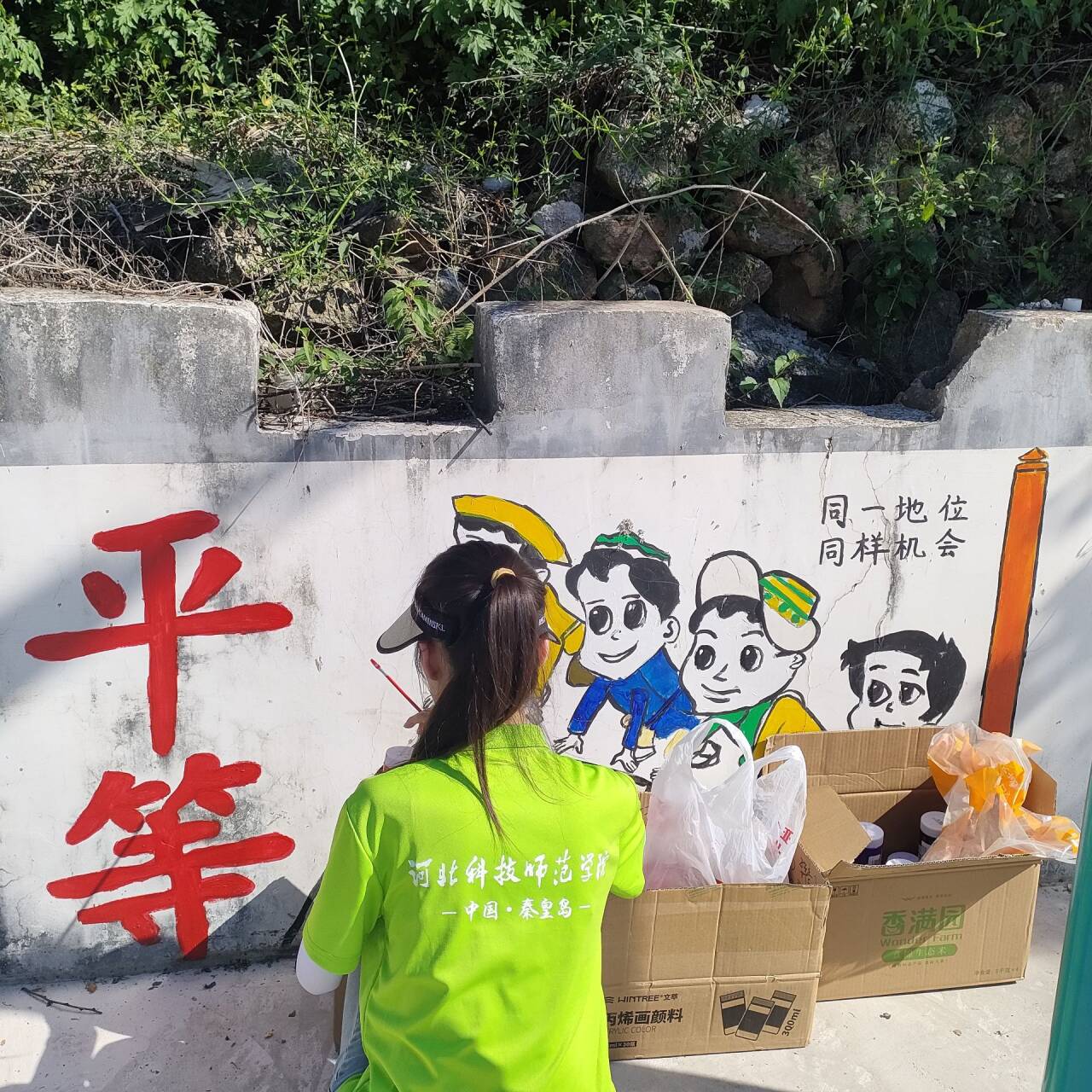 实践队员正在绘制墙画