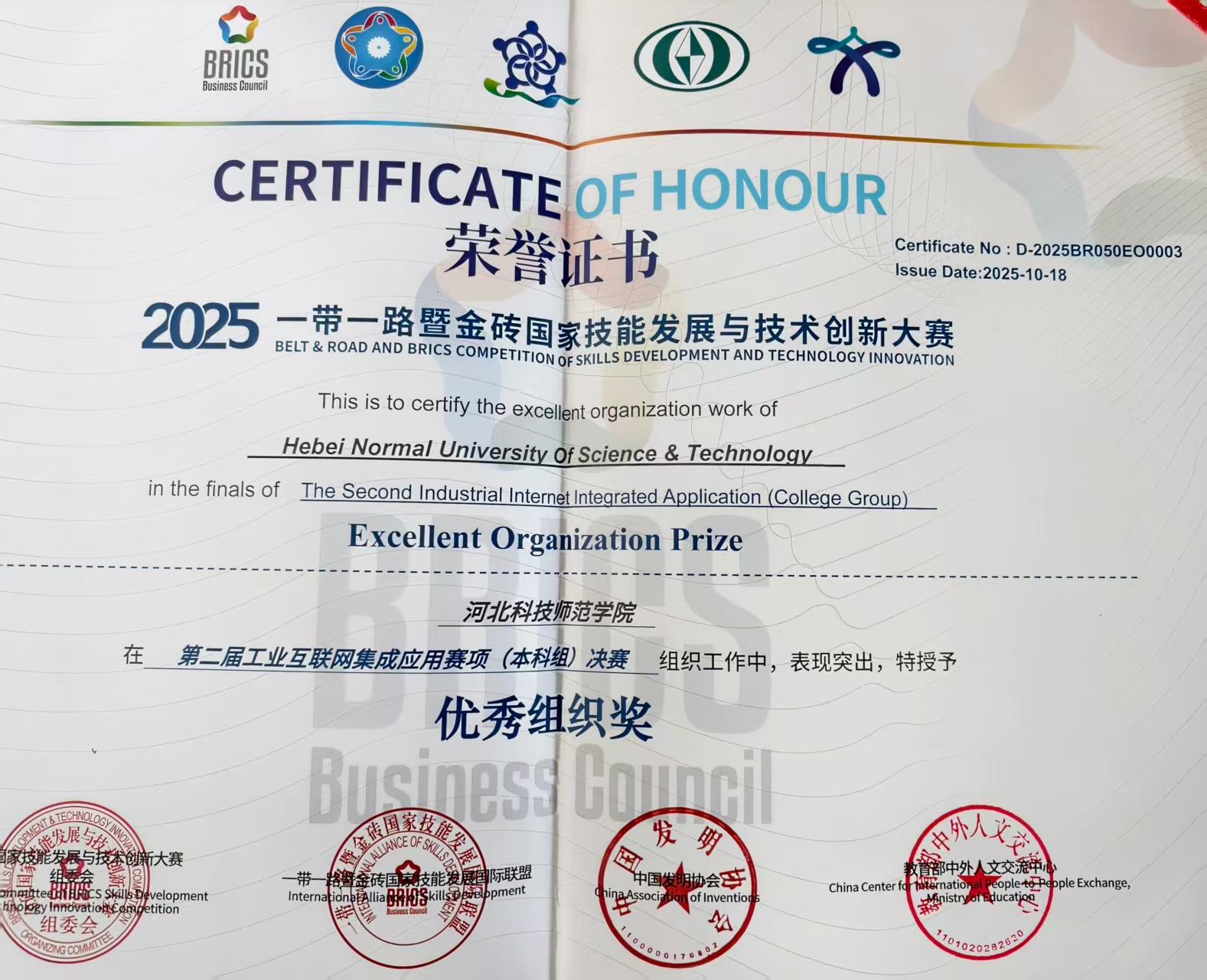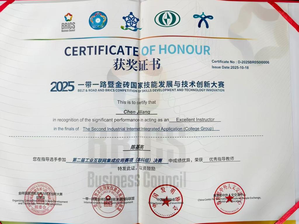 2025年9月14日,第九届“一带一路”暨金砖国家技能发展与技术创新大赛决赛在线上举行。大赛由金砖国家工商理事会中方理事会、一带一路暨金砖国家技能发展国际联盟、“一带一路”暨金砖国家技能发展与技术创新培训中心等单位共同承办,以“推进技能合作,赋能产业创新”为核心,吸引全国多所院校精英团队参赛。Beat365官方网站海联创新基地学子在赛事中表现突出,斩获佳绩。