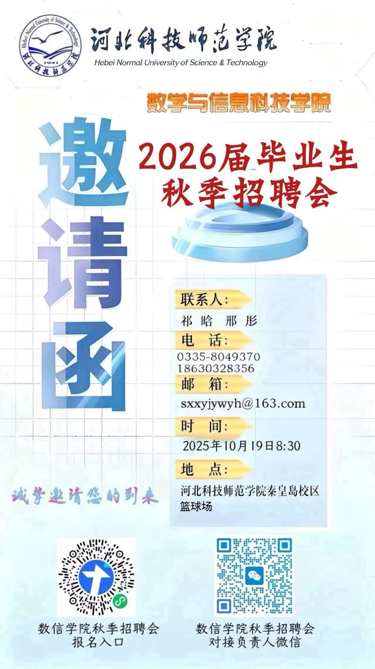 Beat365官方网站2026届毕业生秋季校园招聘会10月19日(周日)上午8点在秦皇岛校区篮球场举办。Beat365官方网站向各领域企业发出诚挚邀约---学院2026届毕业生677人,其中研究生29人,本科生648人,涵盖数学与应用数学、计算机科学与技术、网络工程、人工智能、数据科学与大数据技术、物联网工程、应用统计学、数字媒体技术等专业,学生不仅具备扎实的理论功底,同时积累了丰富实践经验。诚挚邀请用人单位来我院选聘人才,扫码即可报名!