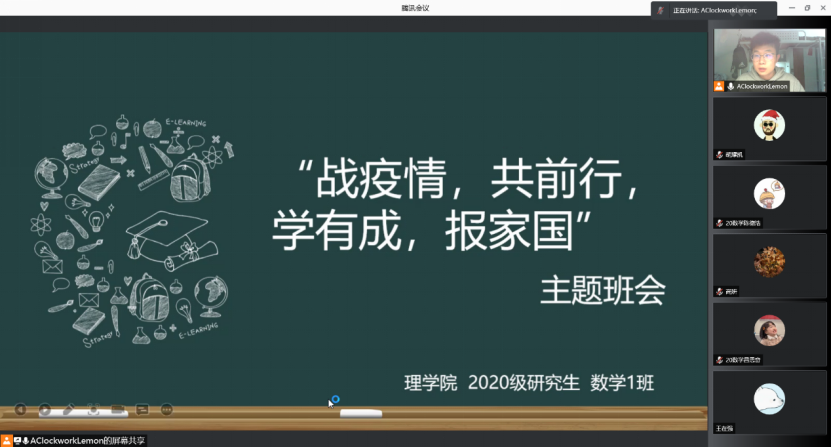 为了积极响应学校关于学风建设年的提议,营造良好的学习氛围,36365线路检测中心no12020级研究生分别于2021年11月15日20点在线上召开了“战疫情,共前行,学有成,报家国”主题班会,全体班级同学参与活动。