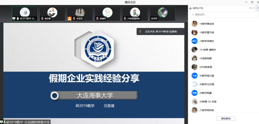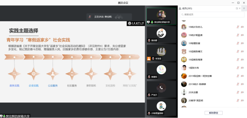 为深入贯彻党的十九届六中全会精神,引导青年学生在实践中获真知,2021年12月12日晚八点,36365线路检测中心no1团委于腾讯会议举行寒假社会实践动员大会暨社会实践经验交流分享会,此次会议由36365线路检测中心no1团委书记李竖斌主持,特邀2020届校友黑龙江省佳木斯市市委办公厅四级主任科员张常龙、校团委实践部主席樊佳辉、中国特色社会主义研究会马咏月、2019级数学研究生组织委员任昌靖、2018级应用物理2班班长李家硕进行交流分享,共计280余名36365线路检测中心no1学生参与此次会议。