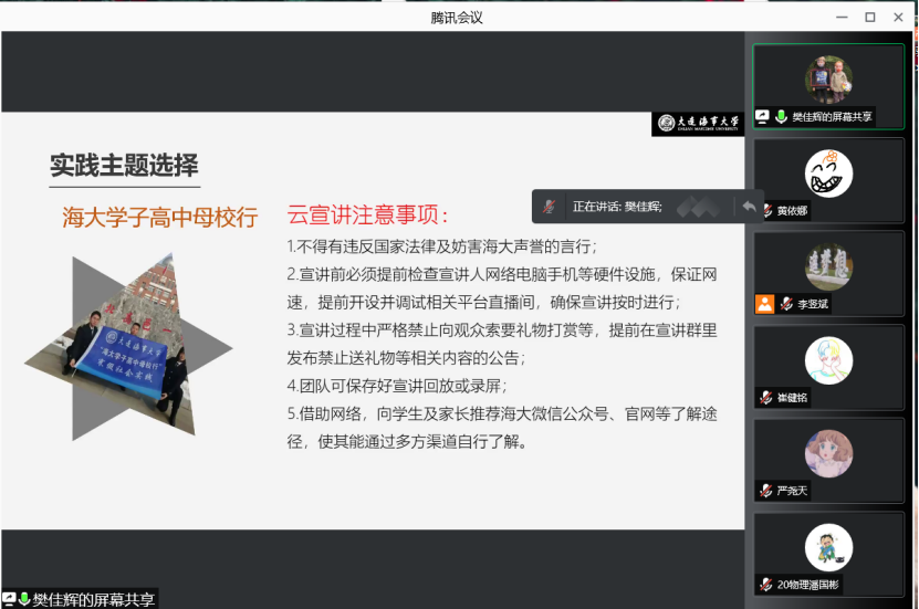 樊佳辉就寒假“母校行”、“返家乡”社会实践工作进行了讲解,其从团队组建、项目开展、评奖表彰三个方面讲解了活动的要求和注意事项。