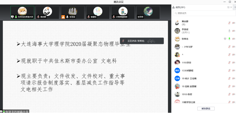 会上,张常龙与就公务员任职以来的心路历程进行了交流分享,其向参会同学提供了公务员考试相关的复习与准备、笔试与面试的建议。
