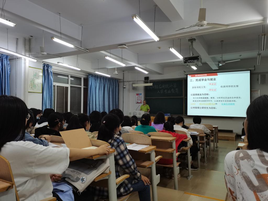 2020年9月21日,应用统计教学部针对2020级新生在逸夫楼A309教室进行了应用统计学专业新生入学专业教育讲座,讲座由刘建平老师主持,毛学志老师对培养方案进行全方位解读,使学生明白四年学习过程、毕业要求和学位授予条件、取消毕业请考和学业预警管理办法,了解将来就业的途径,明确努力方向。