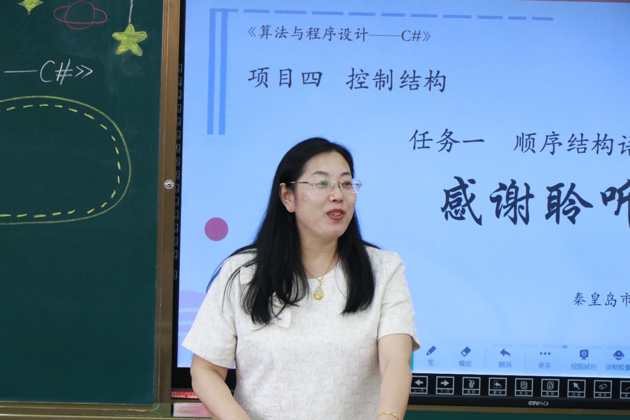 师范生及带队老师听取了计算机专业课教师孙悦老师的《算法与程序设计——C#》——“顺序结构语句”的授课。课堂教学环节齐全,充分利用了启发性原则、直观性原则、巩固性原则、理论联系实际原则等教学原则和角色扮演法、案例教学法等教学方法,配合信息化教学手段,学生做中学、教师做中教,突出了教学重点,突破了教学难点,充分发挥了学生的主体作用,收到了良好的教学效果。